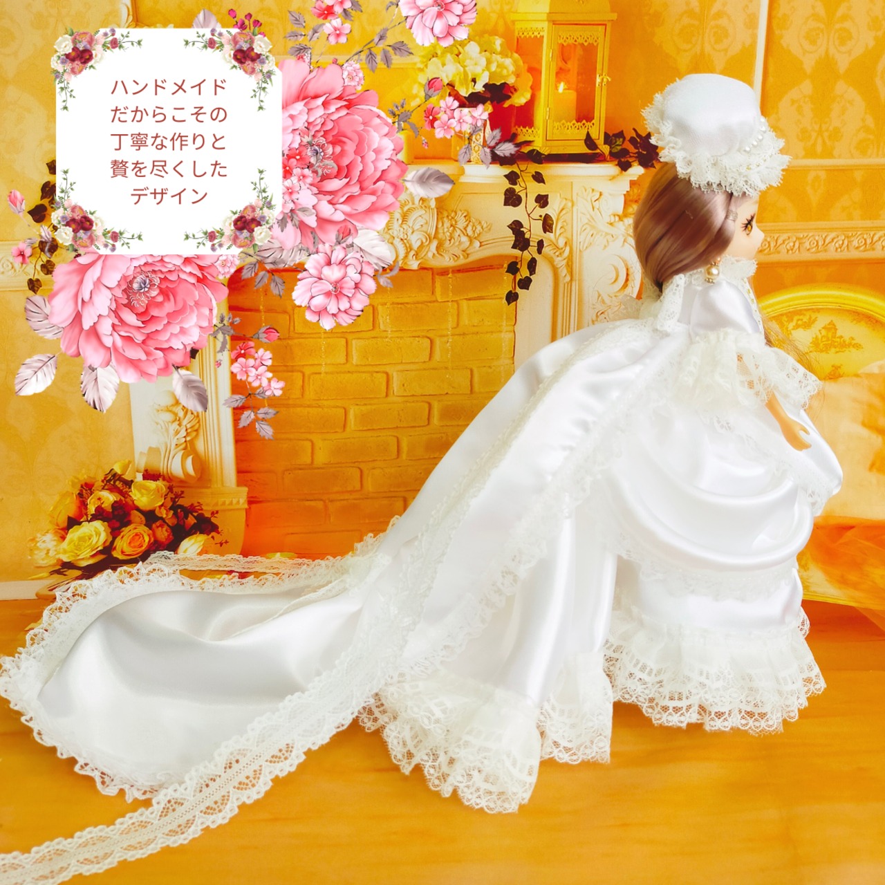 贅沢な時間と愛情をこめて制作したバッスルスタイルのウェディングドレスで、ドールと一緒に特別なひと時をお過ごしください。