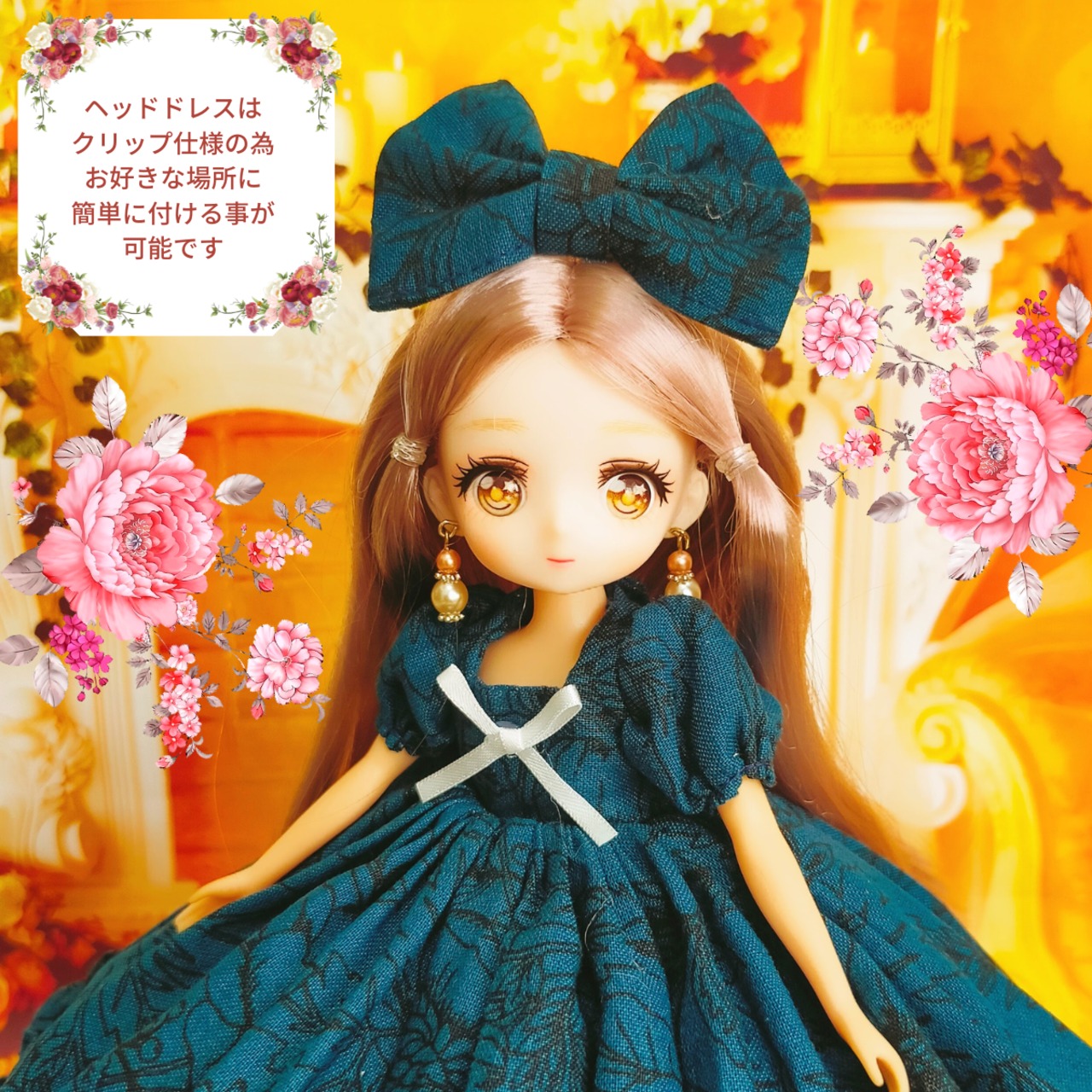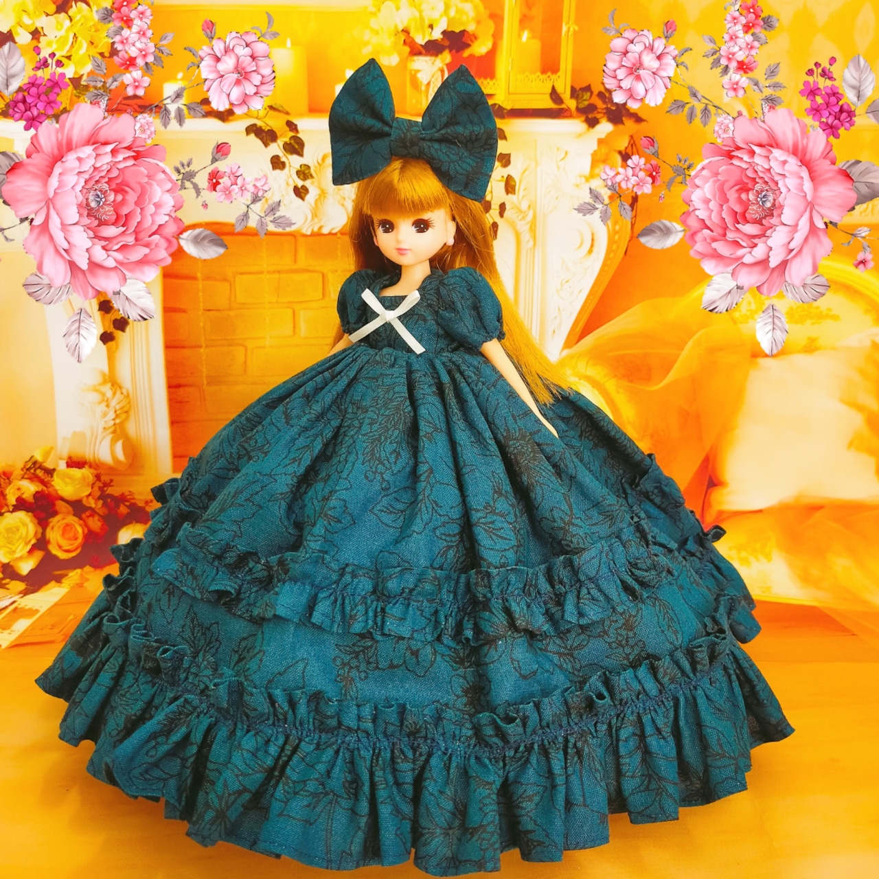 お値下げ4800円→3600円 リカちゃんサイズ ブルーグリーン 花柄 ドールドレス 22㎝ドール Aライン ハンドメイド ドール服 人形服 ♡レベッカ♡