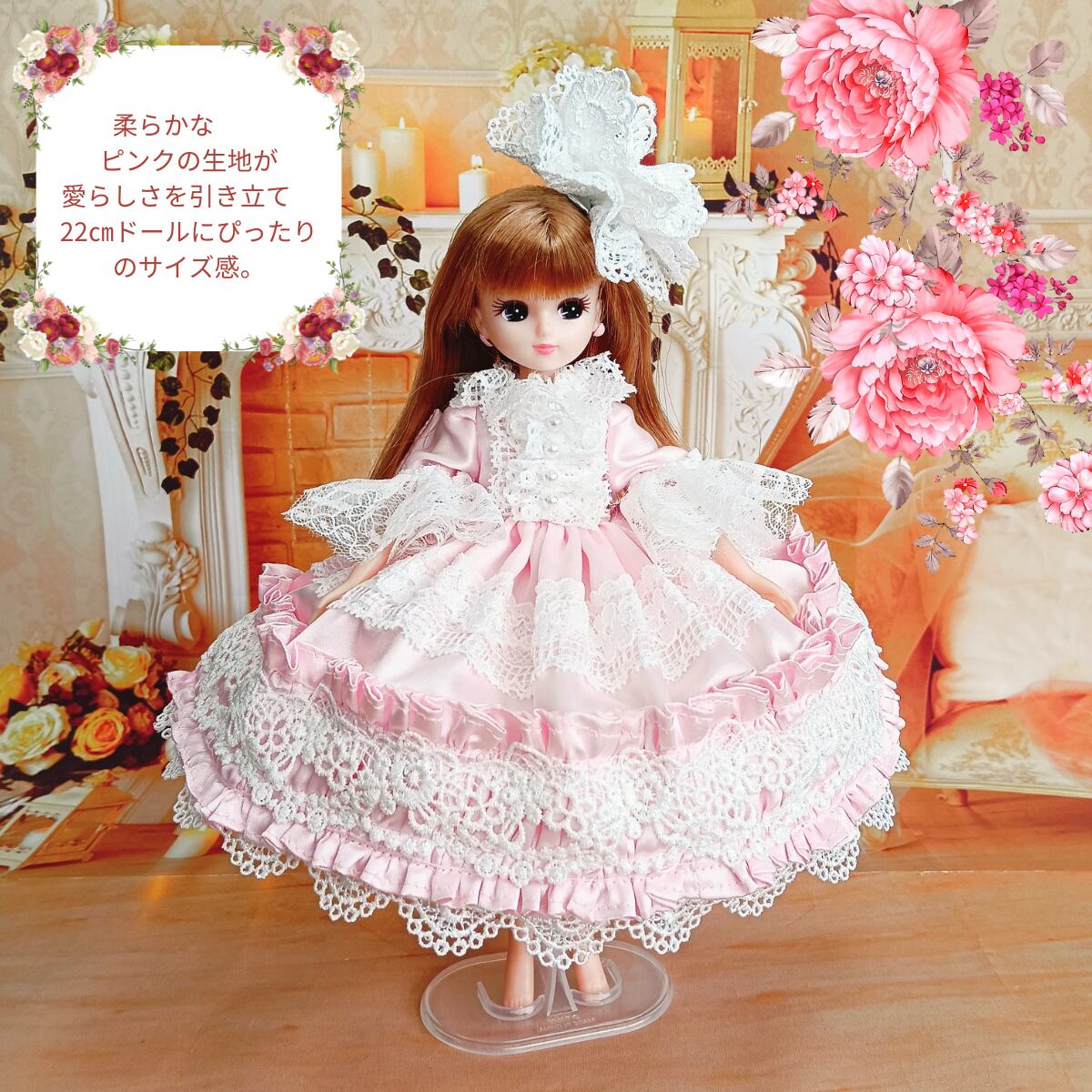 柔らかなピンクの生地が愛らしさを引き立て、22㎝ドールにぴったりのサイズ感。