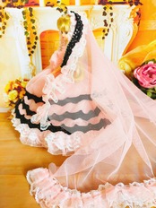 ドレスの裾部分には、ピンクのオーガンジーレース・白いフリルレース・