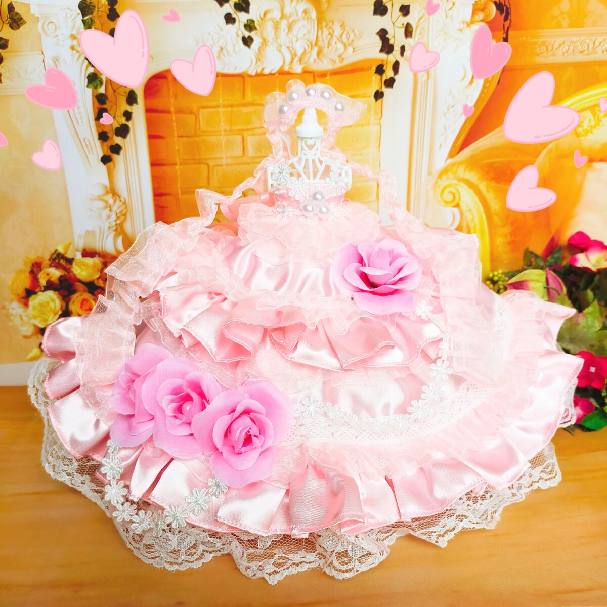 光沢のある淡いピンクの生地でドレスを仕立てています。