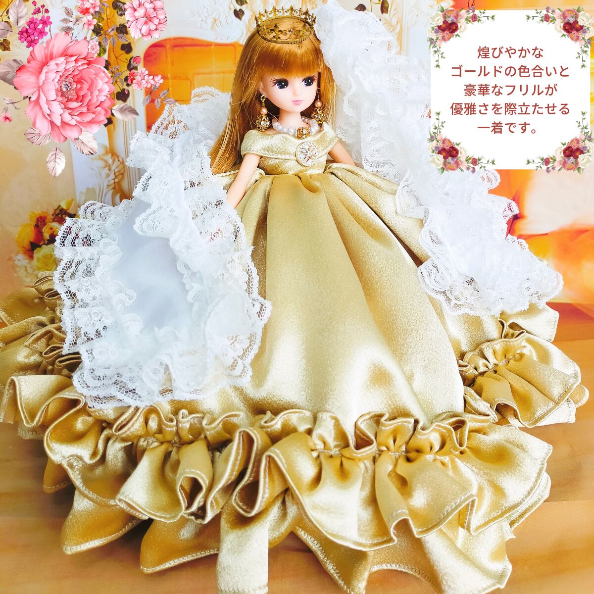 リカちゃんサイズ ゴールド 王女様ドレス プリンセス ハンドメイド ドール服 人形服 ドールドレス ♡ベルナデット♡